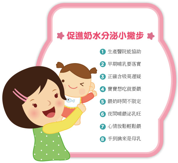 - 媽媽一直擔心奶水不足的心理壓力,反而會抑制泌乳功能,所以哺餵時 放鬆心情,並且相信自己能成功,是十分重要的。