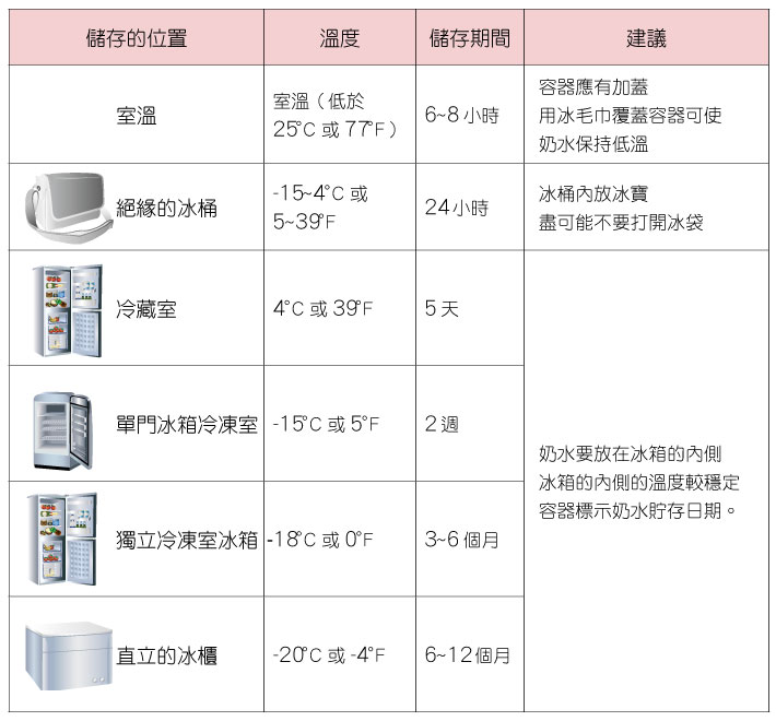 - • 奶水收集後放在冰箱冷藏室(0-4℃ ) 可保存5 天,放在單門冰箱 的冷凍室(-15℃ ) 可保存2 週,放在雙門冰箱之獨立的冷凍室中 (-18℃ ) 可保存3 ~ 6 個月。